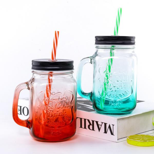 Custom Design Logo embossed colored juice drink glass mason jar with handle and lid Images |